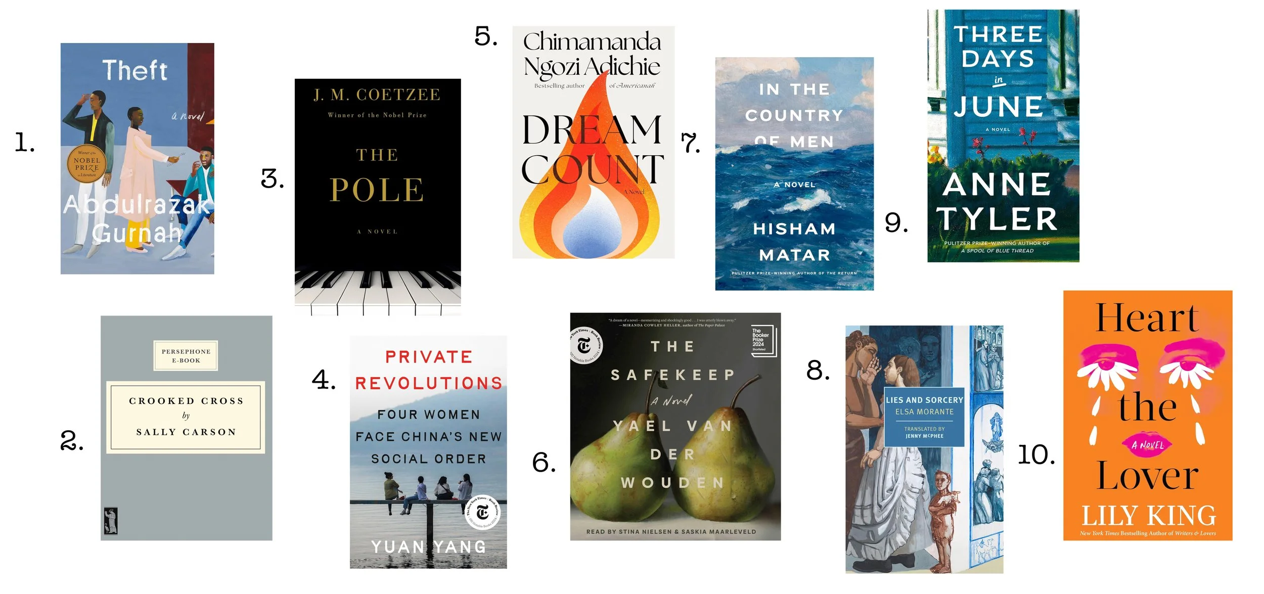 (10) Heart the Lover - I know Sally Rooney and Ottessa Moshfegh are the big female names if literature these days (and they’re both very good), but wow do I love Lily King.